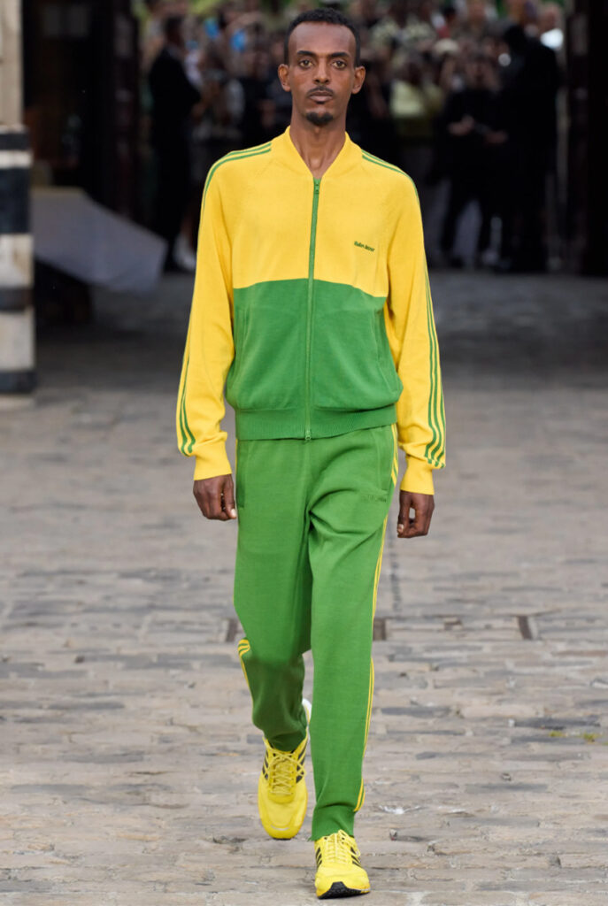 At Wales Bonner’s spring 2024 show in Paris overnight, the designer’s trademark shirting, elongated tunics and dainty, ballet-like shoes appeared alongside looks from her new Adidas collection. The most notable of these being a duo of brightly coloured tracksuits in superfine knit; one in royal blue and red, the other in green and gold — we hope the Australian Olympic team is taking notes.