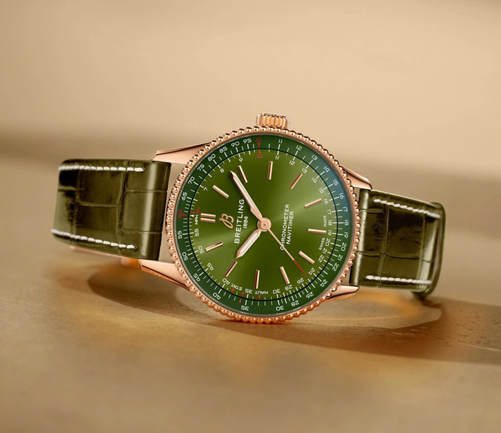The Navitimer Automatic 36 comes with a green monochrome dial, while the smaller Navitimer 32 has a brown dial with diamond hour markers and is powered by Breitling’s SuperQuartz movement.