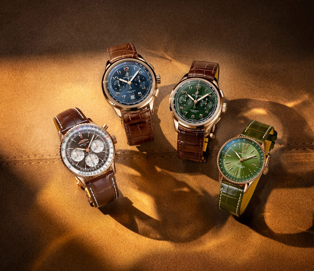 The range includes three Navitimers and two Premiers, combining case materials and dial colours that have not appeared together before.