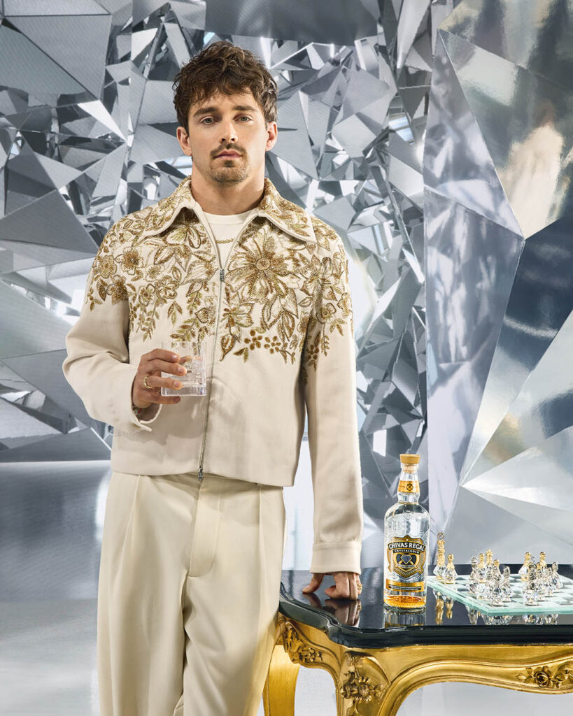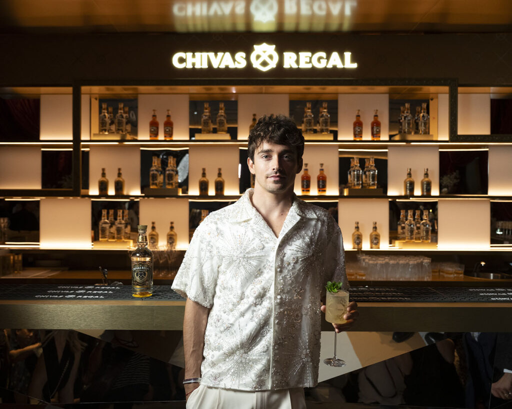 FOR MORE THAN TWO CENTURIES, the name Chivas Regal has conjured up imagery of shadows; evocative tropes of a complex, crafted and sultry amber liquid best enjoyed when the lights are low. Yet, this week, the Strathisla-based house launched an entirely new drop that turns every trope on its head, upends every expectation of the Scottish whisky brand and is coming to disrupt the clear spirits category too. And it brought its superstar Global Ambassador, Formula 1 Racing Driver, Charles Leclerc, along for the ride. Meet: Chivas Regal Crystalgold.