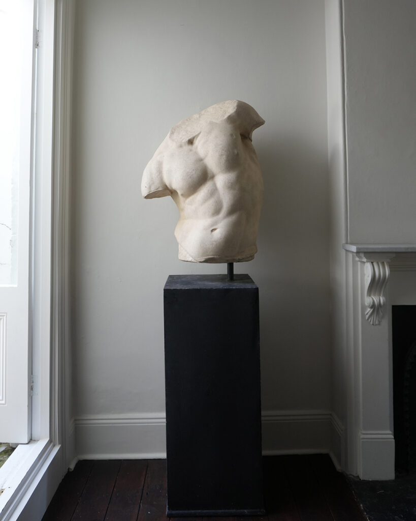Now, we have a soaring painting by Australian visual artist Alan Daniel Jones in our formal lounge that’s far larger than I would’ve ever selected for that particular wall. Alongside it stands an antique marble-composite male bust, an imposing 2.1 metres tall, that gives the room a striking, museum-like feel.