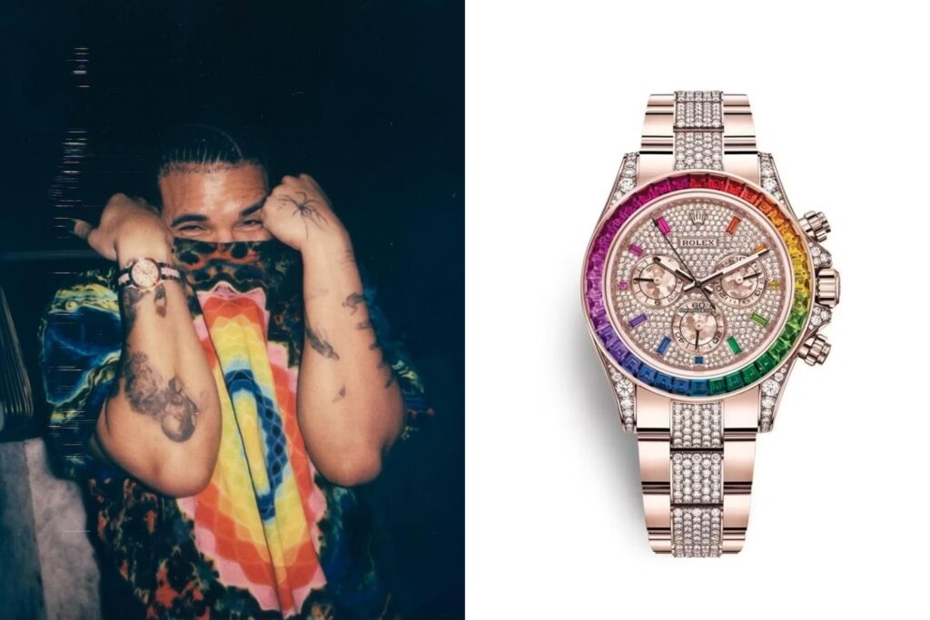 If you know anything about watches, you’ll know that the Rolex Daytona is one of the most coveted models in the industry. Drake’s version comes in 18-carat, diamond-encrusted Everose gold, with rainbow-coloured jewels across the bezel and hour markers.