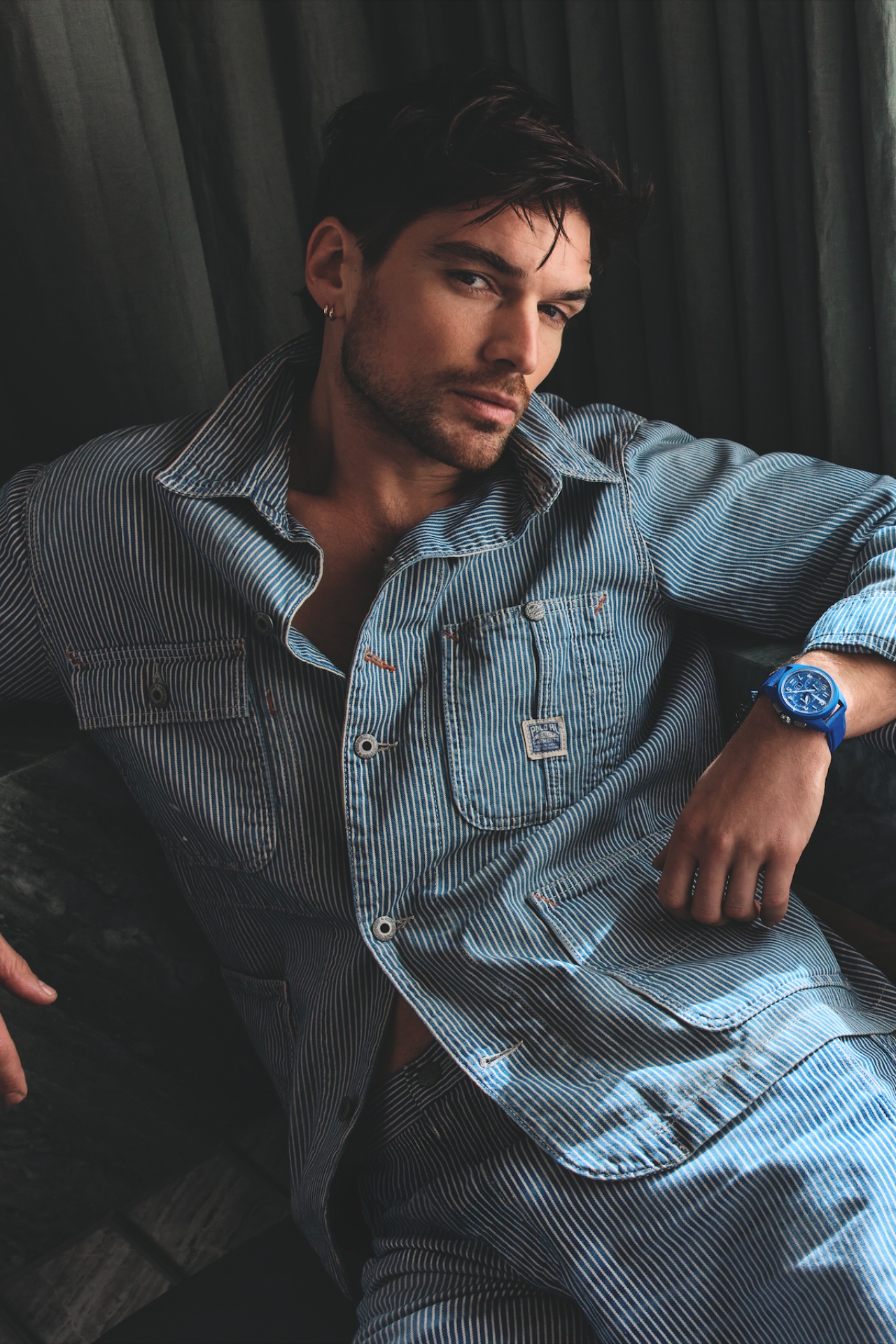 “It is a Zenith,” he says, when I ask about it. “I think they’re really stylish. I like the aesthetic of them. I was drawn to watches that have a diving connection ’cause I’ve done a bit of diving.”