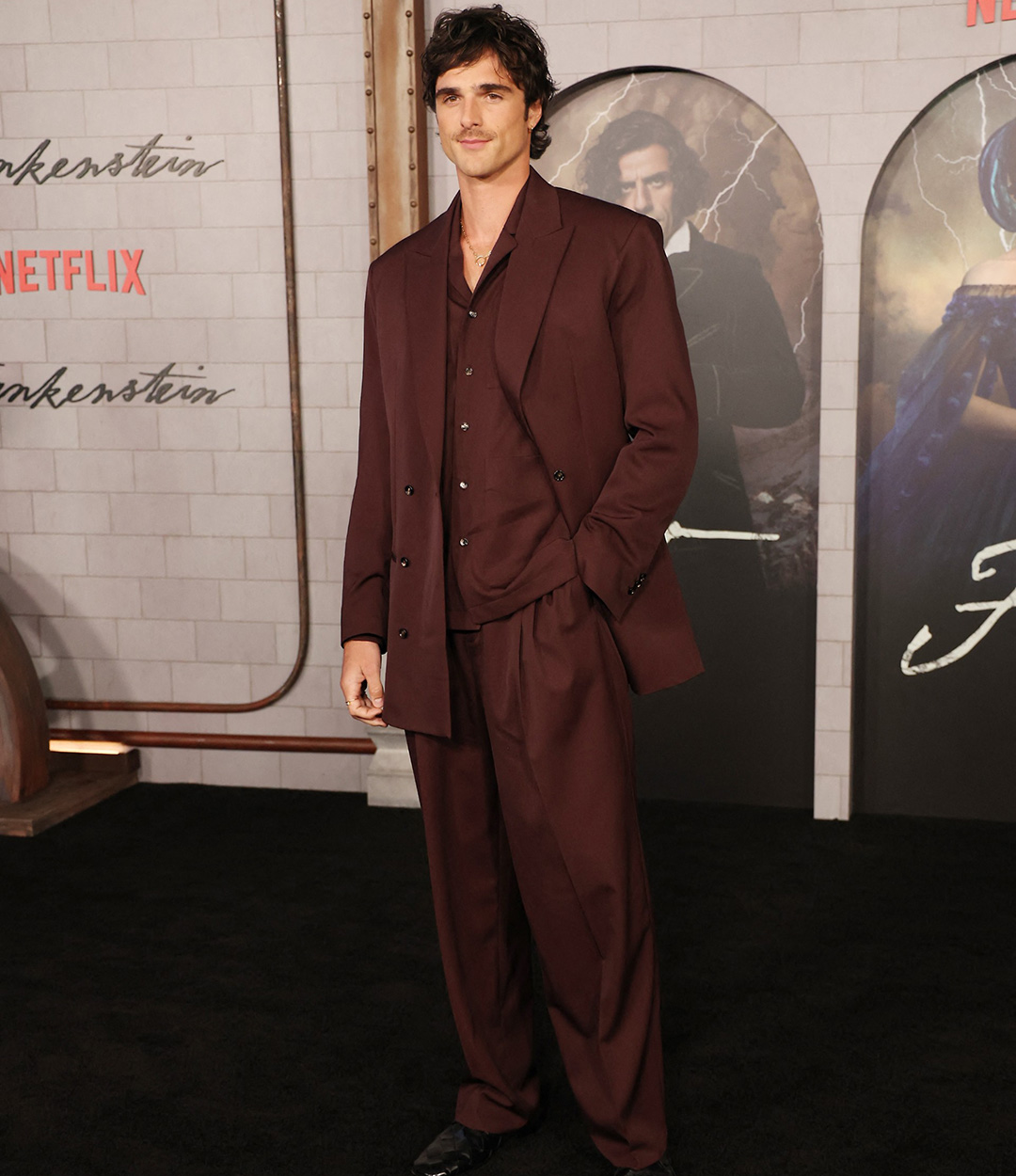 At the LA premiere of the Guillermo del Toro-directed flick, Elordi arrived on the red carpet in a rich, chocolate brown suit. It was look 48 from Trotter’s debut collection for the Italian fashion brand, which showed just over a week ago at Milan Fashion Week. Only instead of the salmon-hued shirt with a wide collar, Elordi’s stylist team chose a matching shade shirt. It was a relaxed look acclimatised to LA’s temperate weather.