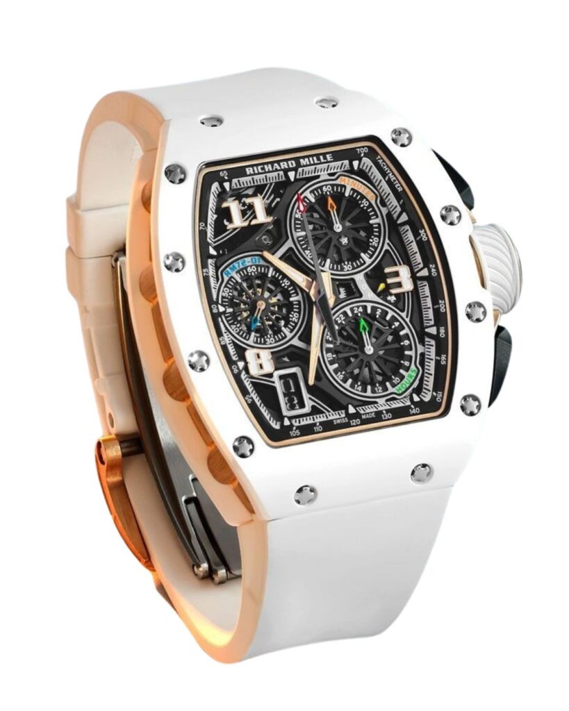 On his wrist you can see the pristine white outline of a Richard Mille RM 72-01 Automatic Winding Lifestyle Flyback Chronograph, one of the brand’s most technically important modern releases. Introduced as Richard Mille’s first fully in-house automatic chronograph, the RM 72-01 is built around the calibre CRMC1, an integrated column-wheel movement that uses dual oscillating pinions instead of a traditional horizontal clutch to engage chronograph functions. This configuration reduces friction between components and supports long-term mechanical reliability under frequent use.