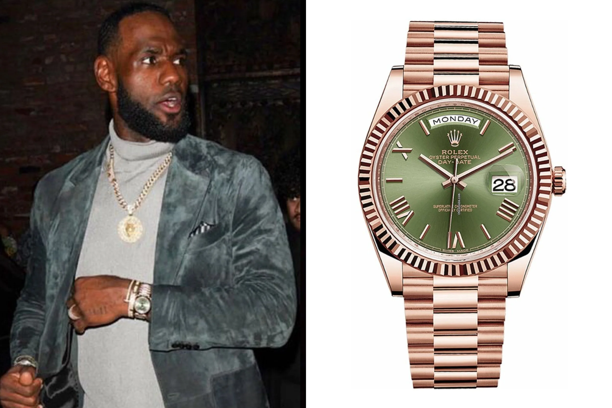 LeBron wore this Rolex in 2023 to watch Lionel Messi’s first game with Inter Miami. It features a 40mm case in the 18-carat pink-gold Everose alloy and an olive-green dial with a sunray finish. Other highlights include the fluted bezel, President bracelet and day and date windows.