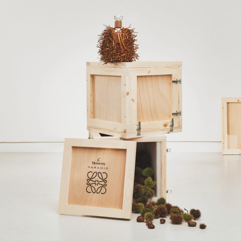 The design is inspired by the cupule (or burr) of a chestnut since Hennessy traditionally employs chestnut wood as part of its cognac production. In brown, the stimulus is obvious, but the “nest” is available in two alternative colours that nod to Anderson’s fantastical artistic choices.