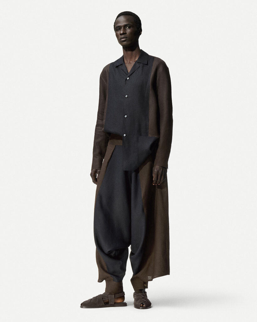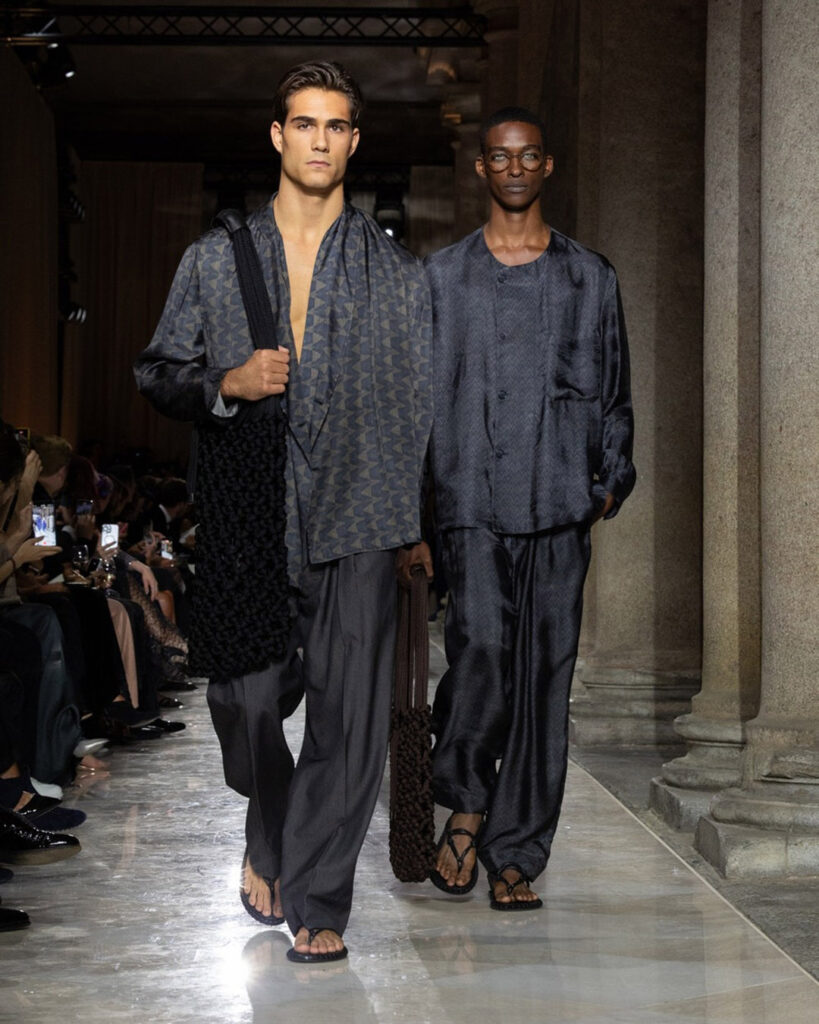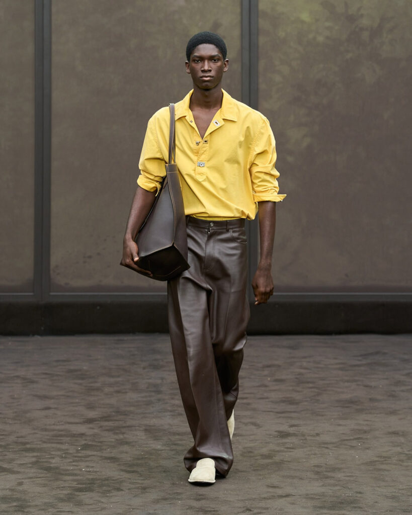 Travel was clearly on Davis’ mind when creating the collection: a merger of both the Italian jetset and Ferragamo’s personal connection to “Africana” aesthetics back in the 1920s. A century on, and the defiance of the Flapper era and its attunement to rebellion still holds up. Tailoring was languid, belted with draping sashes or worn loosely with sandals. Leather trousers seem to be having their moment this season and Ferragamo’s combined structure and volume in their version, paired with a polo shirt with some serious hardware.