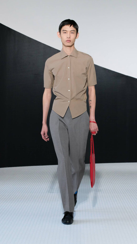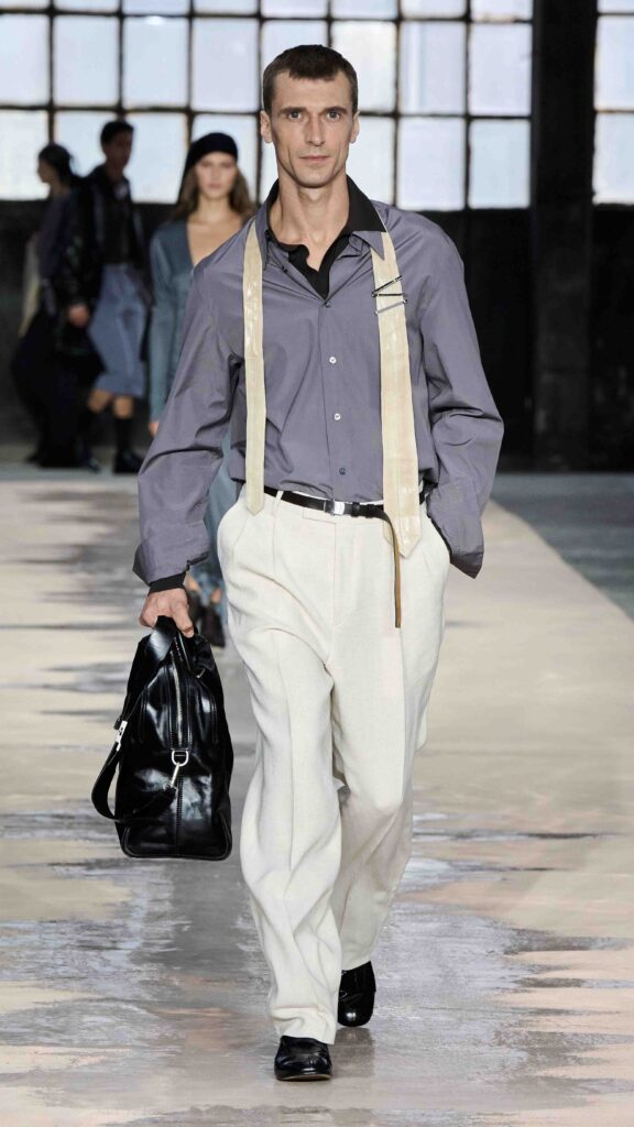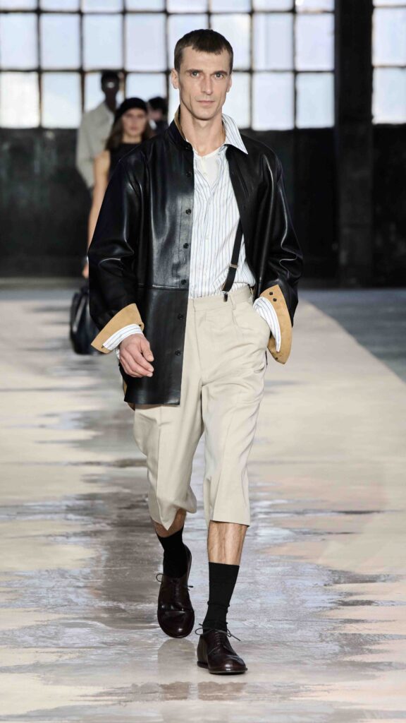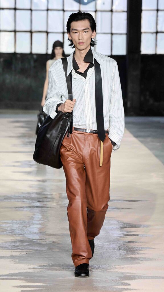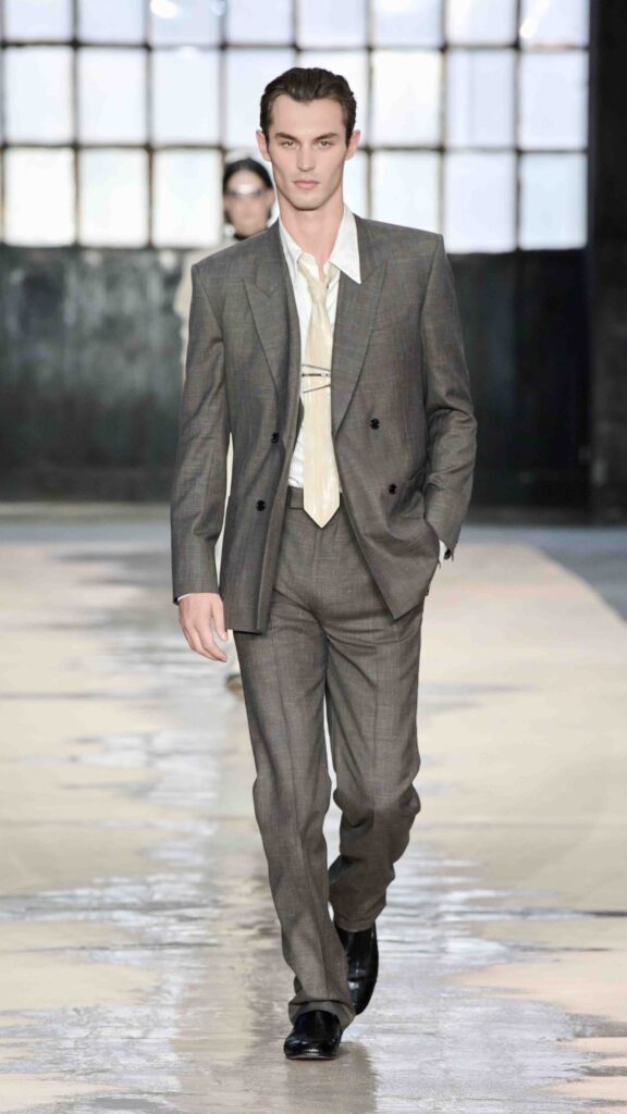 There were even moments of true humour – three-quarter trousers worn with braces that looked like corporate lederhosen. Morning commute aesthetics, ties undone and dangling over russet leather pants. BOSS has always cornered the market for clothing that captures the energy of the city and to see them lean into its movements is refreshing. Equally refreshing, the lack of athleisure moments. Structure can be comfortable, details can be soothing. Gen Z have become masters of compartmentalising their lives, unlike the Gen Y hustle mentality, and the demarcation between workwear and off-duty has slowly returned. BOSS, it looks like, have locked in on this.