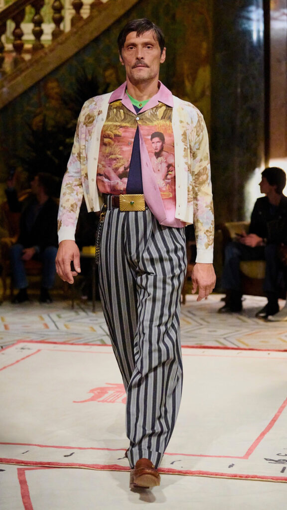 The city of Rome has always inspired Fendi as a designer but this felt like a Roman holiday. Floral motifs across both mens and womenswear rounded out what were already softer-than-usual edges with its drawstring waists and sheer layering. If there was any need for summer body inspiration, it would be this trend for translucent menswear.