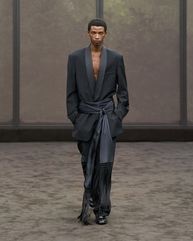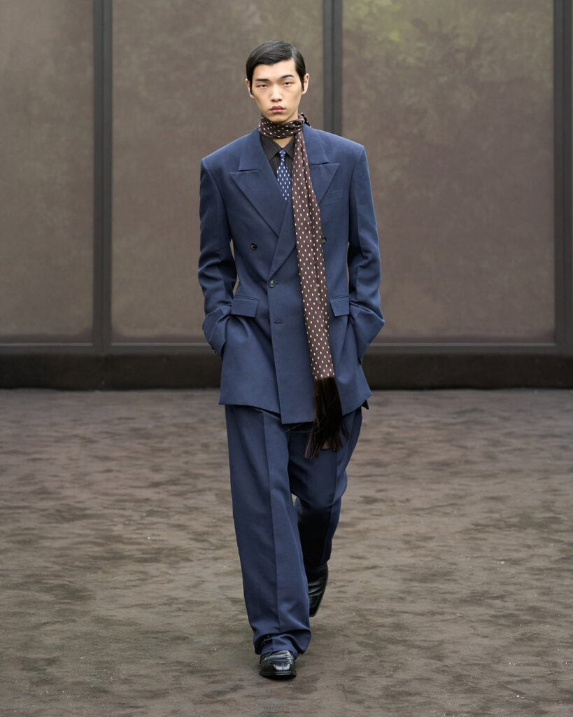 Opening the show was the signature greiges that ran down the spectrum to more vivid blues, purples before setting on evening navy and rich dark blues. It was a rainbow as envisioned by Armani, colourful yet restrained. Woven leather jackets, the looser fits, collarless jackets and had all the markings of his contemporary vision. The velvet tuxedos were a reminder of how deft a hand he was at making menswear as elegant and plush as womenswear. Armani’s clothing has always had a sensual vitality to it, and for this finale it was expressed beautifully.