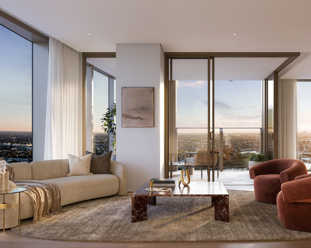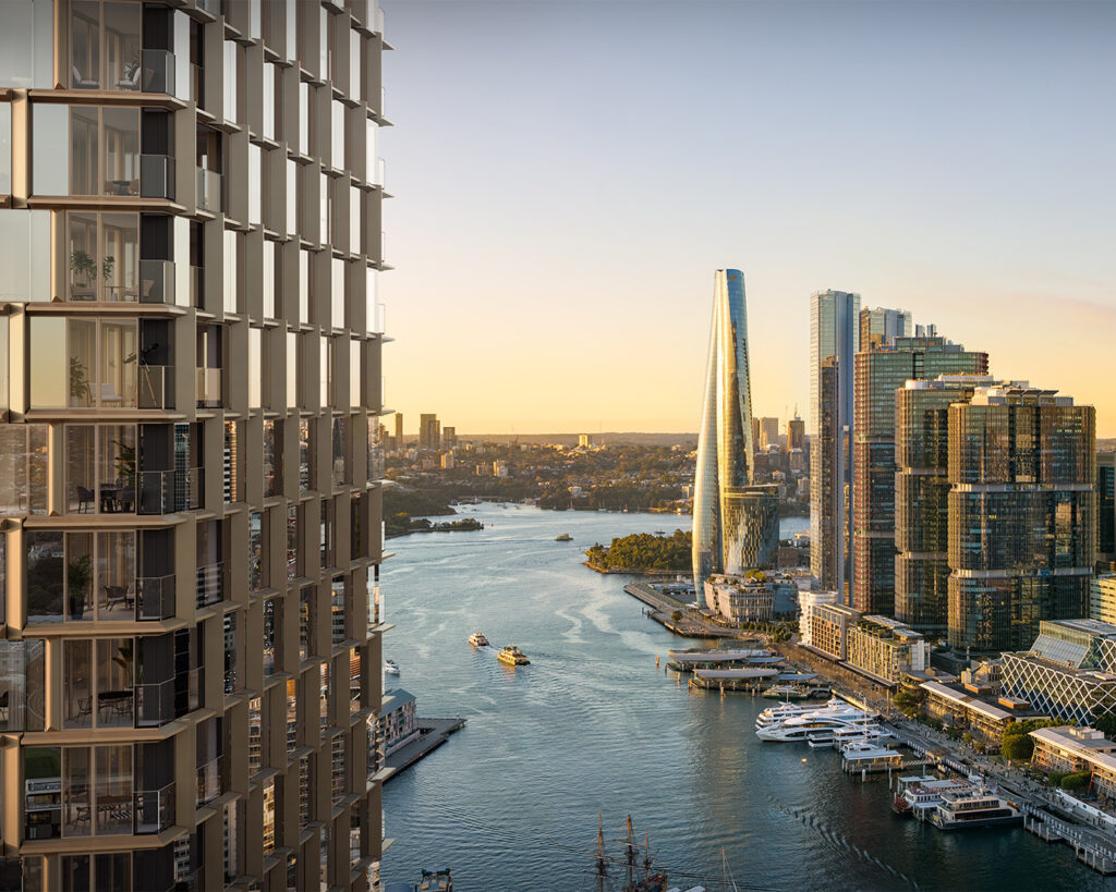 The architecture respects its harbour setting. Natural stone features prominently in palettes that reference land and sea. The apartments themselves, particularly the newly released three- and four-bedroom residences on the upper levels, offer views of Sydney Harbour, the city skyline and westward to the Anzac Bridge and the Blue Mountains.