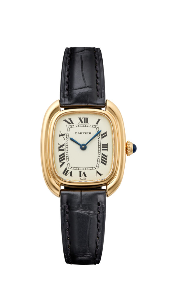 First released in the early 1970s, it emerged from the Maison’s Louis Cartier Collection, an era when Cartier reunited its Paris, London and New York ateliers under a single vision and began producing watches in La Chaux-de-Fonds. The design was daring for its time: an elongated oval of 18-carat yellow gold with a smooth stepped bezel, white dial and blued-steel hands. The original reference 97050 was hand-wound, small by today’s standards, and defined by Cartier’s singular elegance, curves with intent, geometry softened into grace.