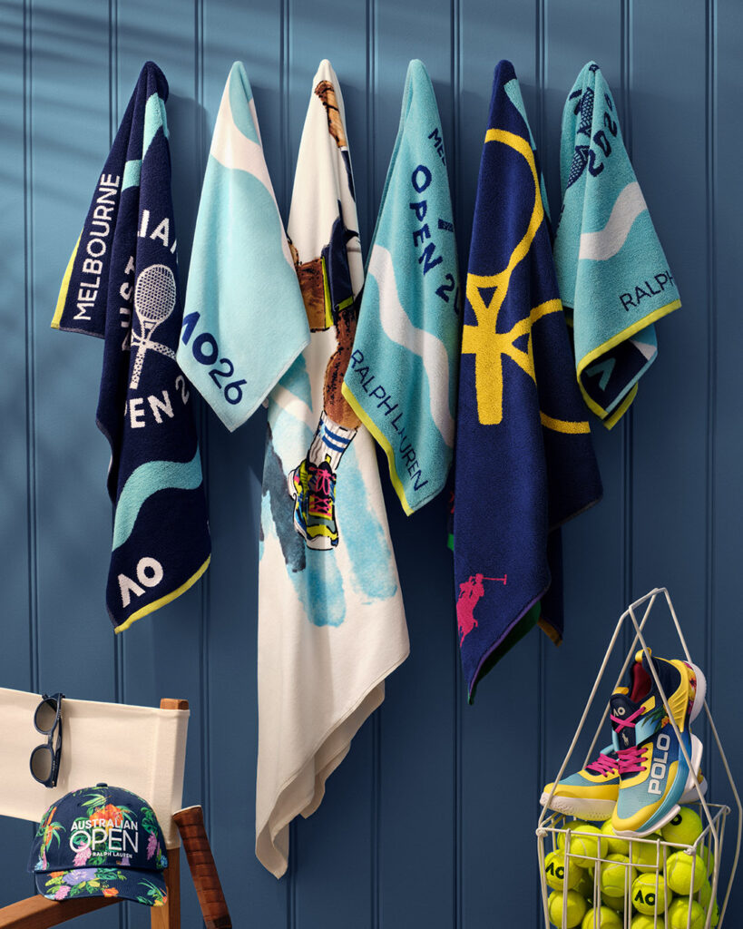 Fans can join the action with the 2026 Ralph Lauren Australian Open Collection, a range of polo shirts, jackets, caps, and accessories designed in a vivid colour palette inspired by the energy of the tournament. The first release, a series of commemorative towels, lands online in October 2025, followed by the full assortment in November at on-site pop-ups, Polo Ralph Lauren stores, and globally online.