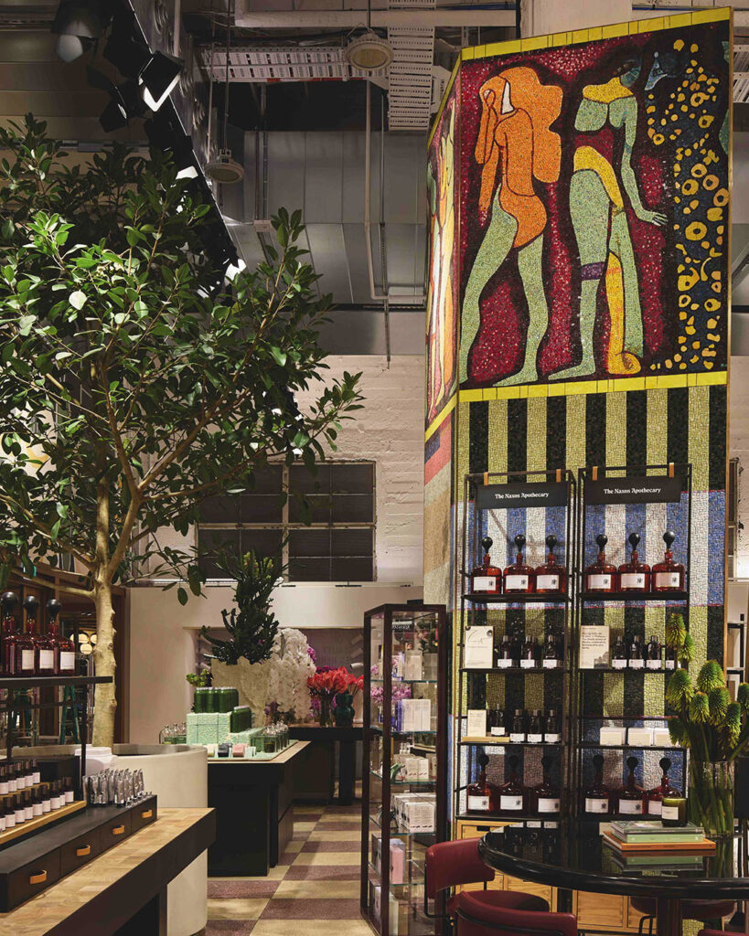 That duality plays out in the details. Trees – four banyan and two Moreton Bay figs – are planted inside the Apothecary and Perfumeria. Upstairs, the Aesthetica Lounge is furnished with rugs, custom seating and works by artists Julie Rrap, Nabilah Nordin and Judy Watson. “We hope visitors feel inspired, curious and welcomed,” the designers say.