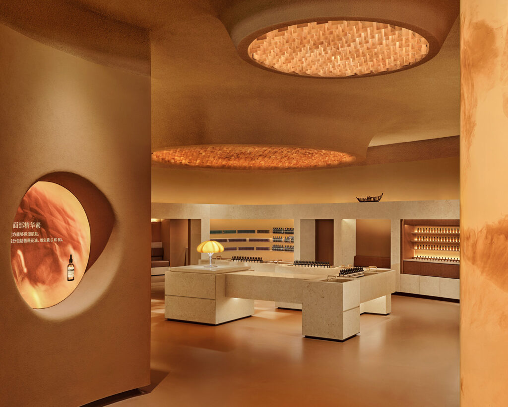 Wellness as architecture didn’t start here. To be fair, Australian skincare brand Aesop has been playing this game for decades. In China’s Hainan, a relatively recent store opening resembles an underwater cave, complete with columns wrapped in sustainable, algae-grown polymers that can absorb and release ambient, calming aromas (supplied by Melbourne-based materials lab Other Matter) and ceiling oculi that flicker like ocean light. In São Paulo, Paulo Mendes da Rocha’s team turned civil construction materials of concrete, glass and patterned cement tiles into an elegant apothecary.
