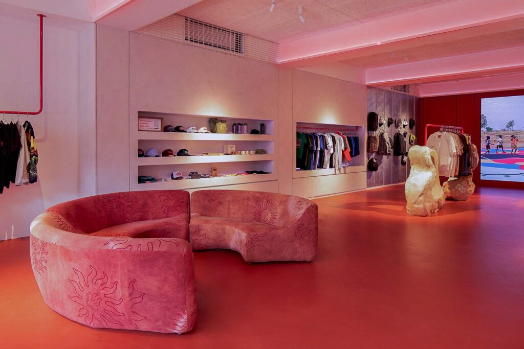 You really can’t miss it – with a red exterior that transports shoppers to the warmth and richness of the Larrakia region, the corner space is full of the brand’s graphic tees and colourful merch, while a giant horseshoe-shaped couch, stone sculptures and artworks by First Nations artists bring the interior to life. With a drive to incubate and amplify culture, uniting people in the progression of creativity, this collaborative, community-driven space feels like the perfect start to House of Darwin’s physical retail footprint.