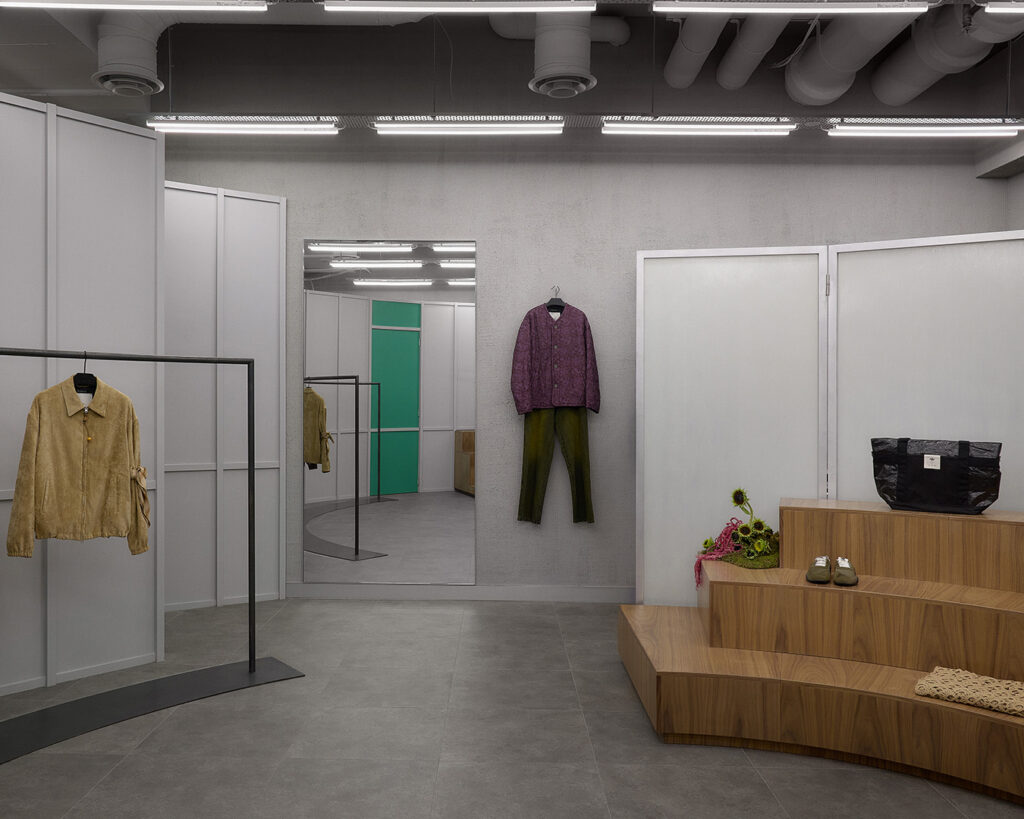 Material contrasts define the space: béton brut concrete, brushed aluminium, and porcelain flooring play against warm timber and wool, echoing the tension between craft and industry that underpins the brand’s approach to clothing. Foolscap Studio’s Adele Winteridge describes the concept as “a setting for life… inviting connection and reflecting Song for the Mute’s commitment to intimacy and emotional depth,” while senior designer Edouard Fenet notes that the design “invites people in… to explore and express themselves.”
