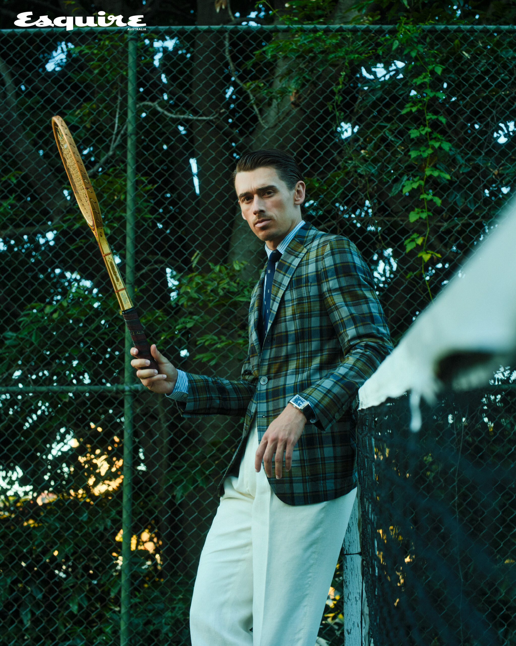 Fritz settles into a wicker chair, framed by an aqua-blue and white-striped picket fence, easy-mannered in the daybreak. The poses are natural. The shoot is quick. It’s as clear as the now cloudless morning: Fritz is a tennis elite, with plenty of star power, too.