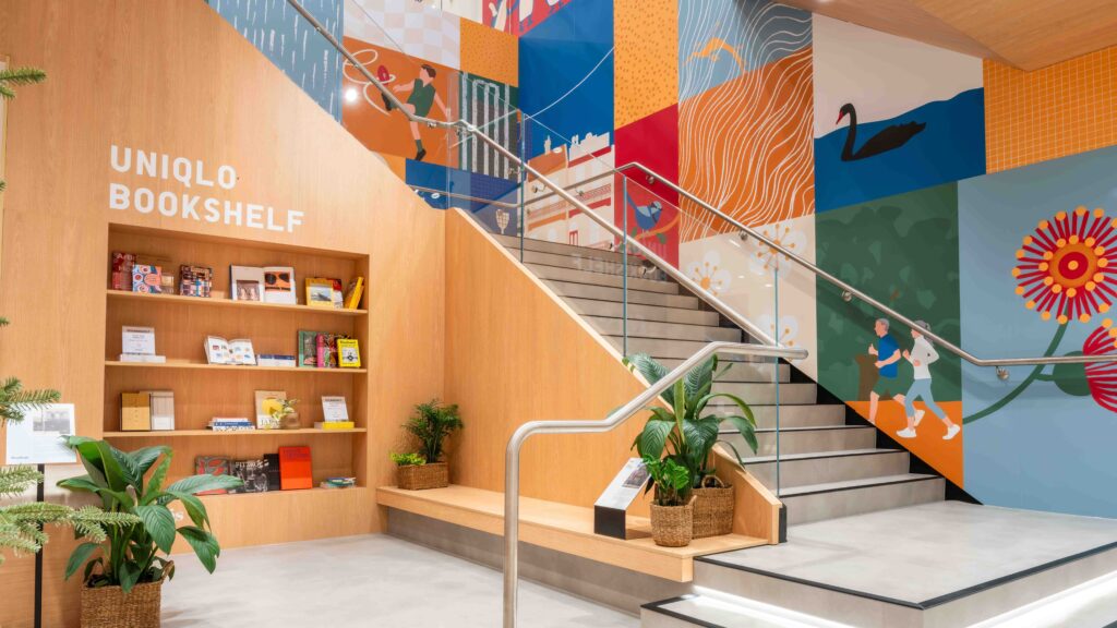 As well as showing the full breadth of its range, UNIQLO Emporium – like all its major stores – reflects its city and shoppers through art. Chief among them is the brand’s longstanding collaboration with local creatives, working with multi-disciplinary artist Beci Orpin to create the printed mural running along the staircase leading to children’s floor.