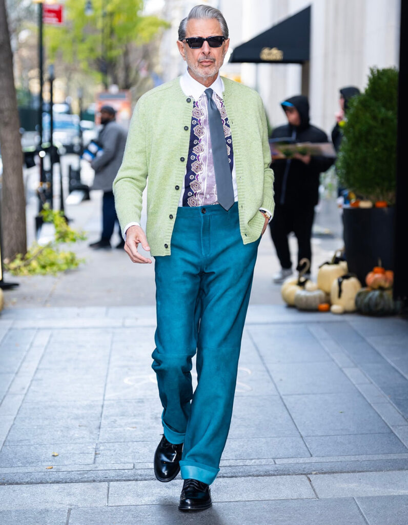 Case in point – the current run of Wicked press tours where Goldblum is sliding down red carpets and leaving hotels in custom Prada. Entirely inspired by his character in the film. (The Wizard Wears Prada is a documentary I would definitely watch, just saying.) Given that the house colour code is a pistachio green, leaning into the signature hue for the Wizard’s off-screen styling choices feels correct and natural. The latest was a lime green cardigan worn over a graphic shirt and ice-blue suede trousers.